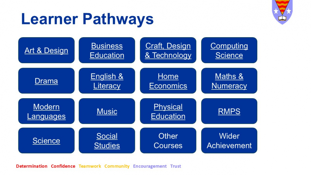 Pupils will continue with English and Maths and will choose any other five from their S3 subjects. All pupils will also be timetabled for core subjects which include PE, RE and PSE.